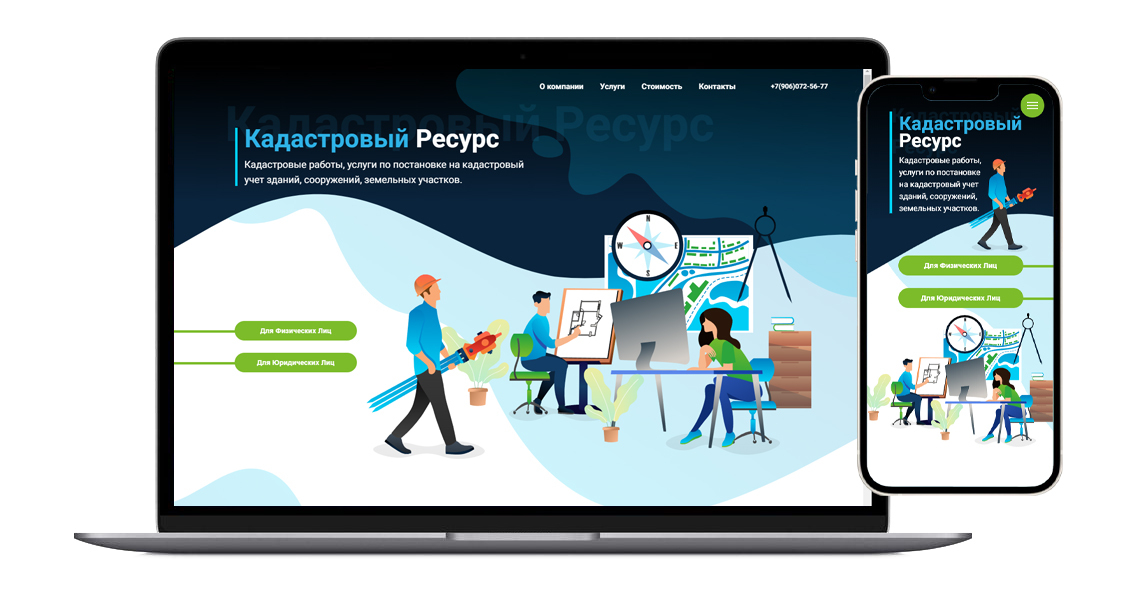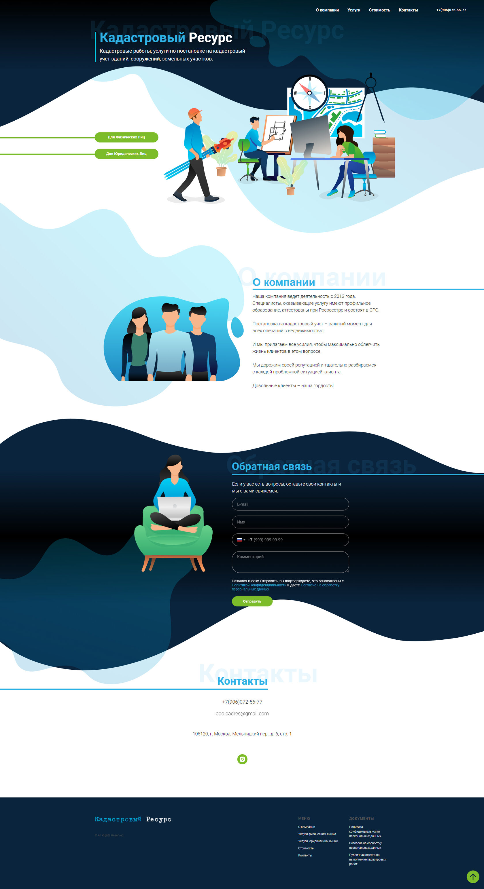 Сайт для компании, занимающейся кадастровыми работами и предоставляющей услуги по постановке на кадастровый учет зданий, сооружений, земельных участков.