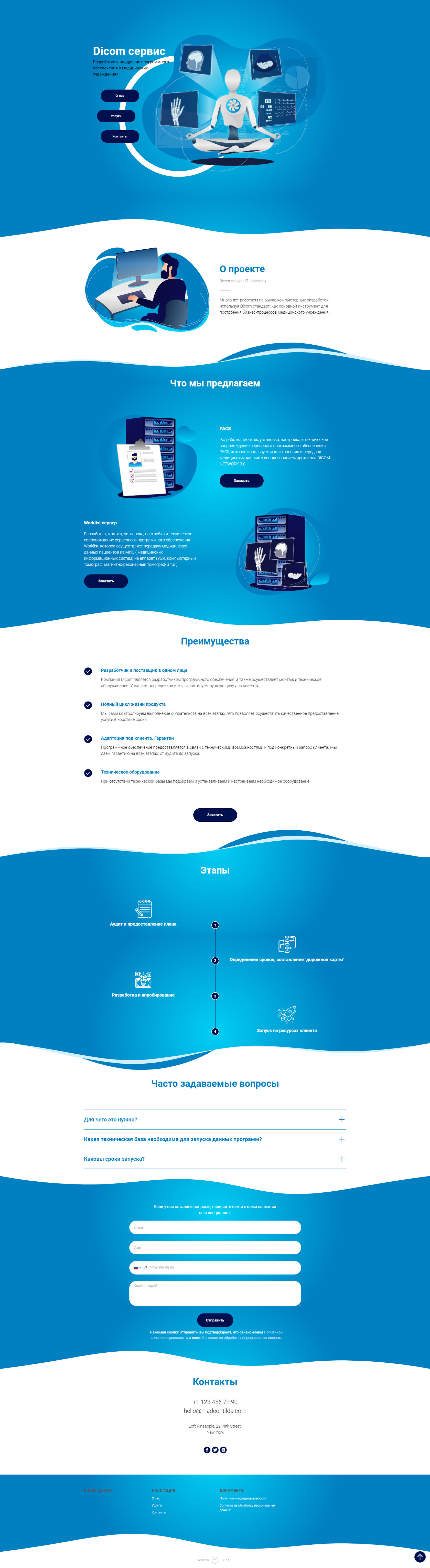 Лендинг-визитка для компании "Dicom сервис", специализирующейся на разработке и внедрении программного обеспечения в медицинских учреждениях.